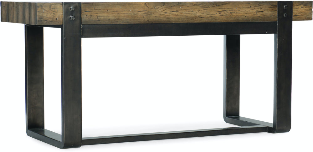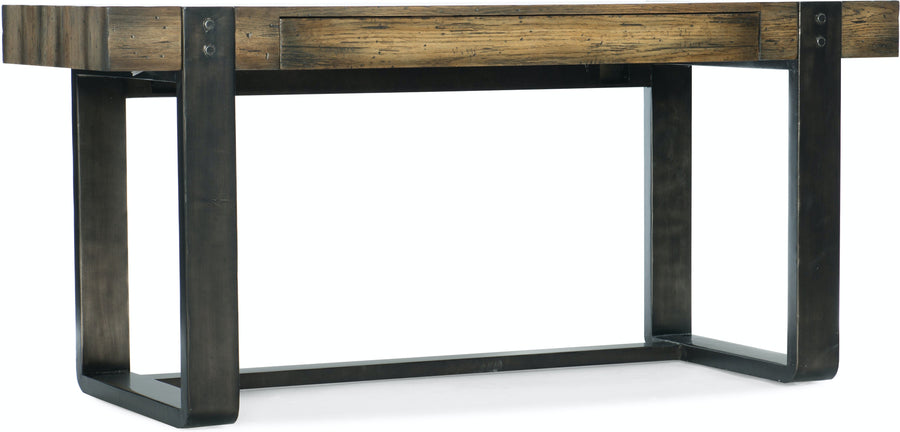 Set a tone of sophisticated rustic appeal in any space with the Crafted Leg Desk, an eclectic modern mix of Oak Veneers and Aluminum Sheet. The aluminum features a dark metal finish to accent the Tobacco Leaf finish of the wood, a color evoking a bourbon barrel burnished over time. This stylish and functional desk offers one drop-front keyboard drawer. When used with the 1654-10364-DKW1 Credenza, the desk can be placed on the left or right to create an L-shaped work space configuration.