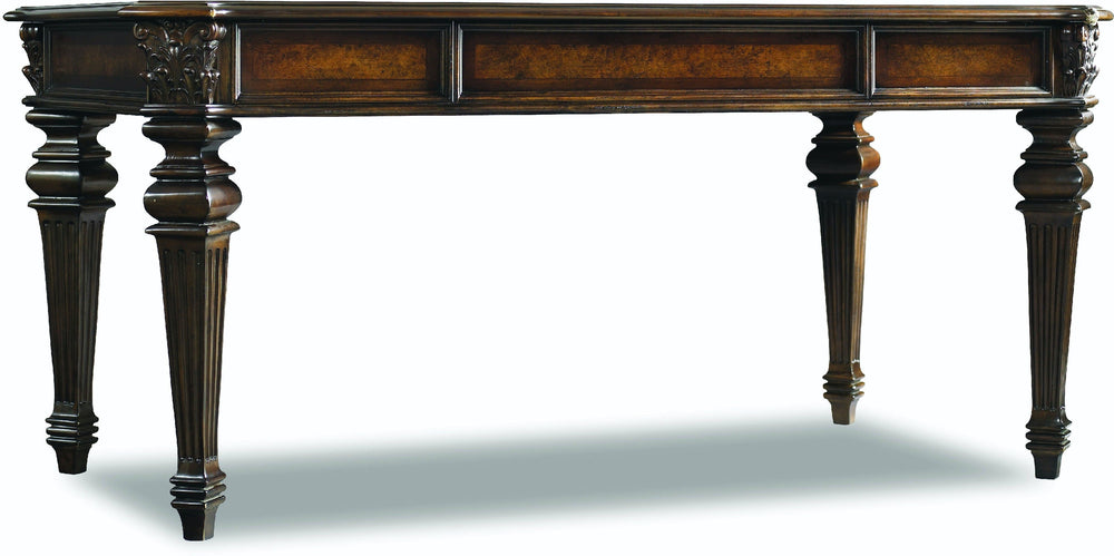 A stunning and stylish work-from-home solution, the European Renaissance 66” Writing Desk combines timeless design details like decorative Cherry and Myrtle Burl Veneers, a dark rich finish and shaped, carved and fluted legs for an Old World elegance. Functional features include three drawers on metal ball bearing slides including two utility drawers with a pencil tray and one center drawer with drop-front for use with keyboards. Levelers included.