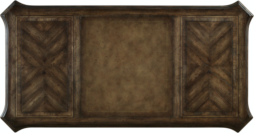 Inspired by a French antique, the classic chevron veneer pattern on the top of the Rhapsody Executive Desk gives striking character to this stunning piece that is a worthy focal point for the office of any successful professional. A center bonded leather writing surface adds to the prestige. Functional elements include a center drawer with drop-front for keyboard use; two drawers with one removable writing insert and pencil tray for use in either drawer and three slots with two removable dividers in each drawer. Two utility drawers and two locking file drawers with Pendaflex letter/legal filing system. The groundbreaking Rhapsody Collection brings together classic design elements, grand scale, and a relaxed rustic finish to create an impassioned marriage of casual opulence. Exuberant scale and serpentine shapes infuse the pieces with emotion, while timeless motifs like scrolls, rope twist molding, the acanthus leaf and fleur de lis anchor Rhapsody in old world charm. Building on the grand scale and classic European design is the defining element of the collection: a walnut-colored finish inspired by the natural yet rustic nature of reclaimed woods in beautiful patinas.