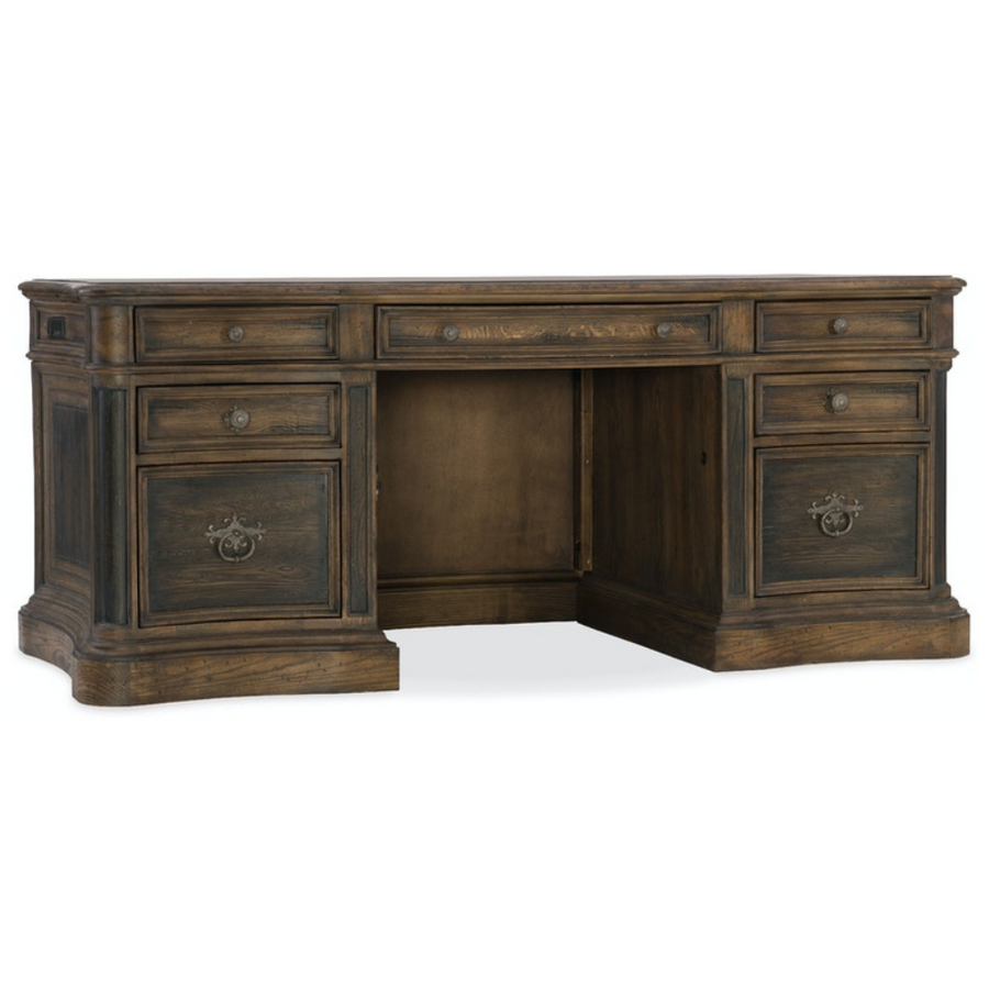 Character emanates from this expansive desk. A two-tone finish combines a saddle brown with an aged black accent finish. Custom-crafted pewter hardware with shaped back plates is inspired by hand-wrought ironworks from Texas Hill Country. Packed with function, the St. Hedwig desk offers a drop-down keyboard drawer, removable mouse pad, pencil tray and dividers and letter/legal files on the left side front drawer. Seven drawers total.