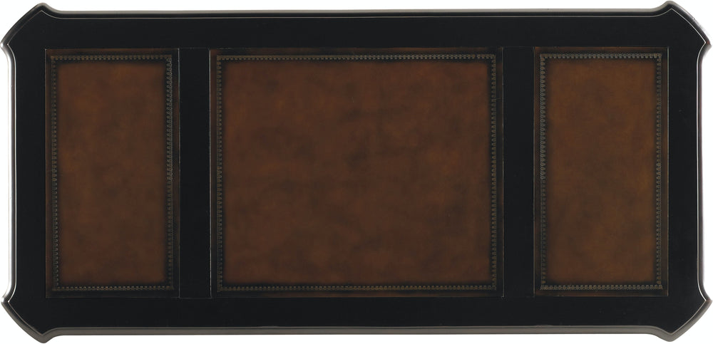 With a hunt country flair and pedigreed design details like a bonded leather top, carved scroll motif accents, and carved leather panel insets on the front of the case with nail head trim, the Telluride Executive Desk makes work an adventure. Crafted of Cherry Veneers with Carved Leather with a black paint finish and reddish brown rub-through, the desk includes 7 drawers on steel ball bearing slides and two file drawers and a center drawer with drop-front for use with a keyboard and two pullout writing slides. A pencil tray can be used left or right, with dividers in the middle drawer.