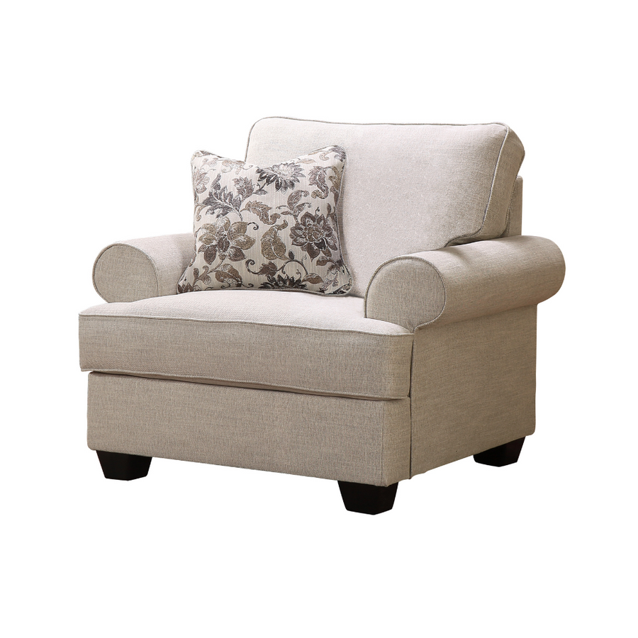 Charming and cozy, Alissa Autumn chair by Roots Furniture ensures comfort and joy. With a deep seat, durable legs, and comfortable cushions, this well-crafted eye-catching piece of art fits in any room. The simple and inviting Autumn color palette (beige, brown, and white) perfectly complements wood and gold accents and accessories.