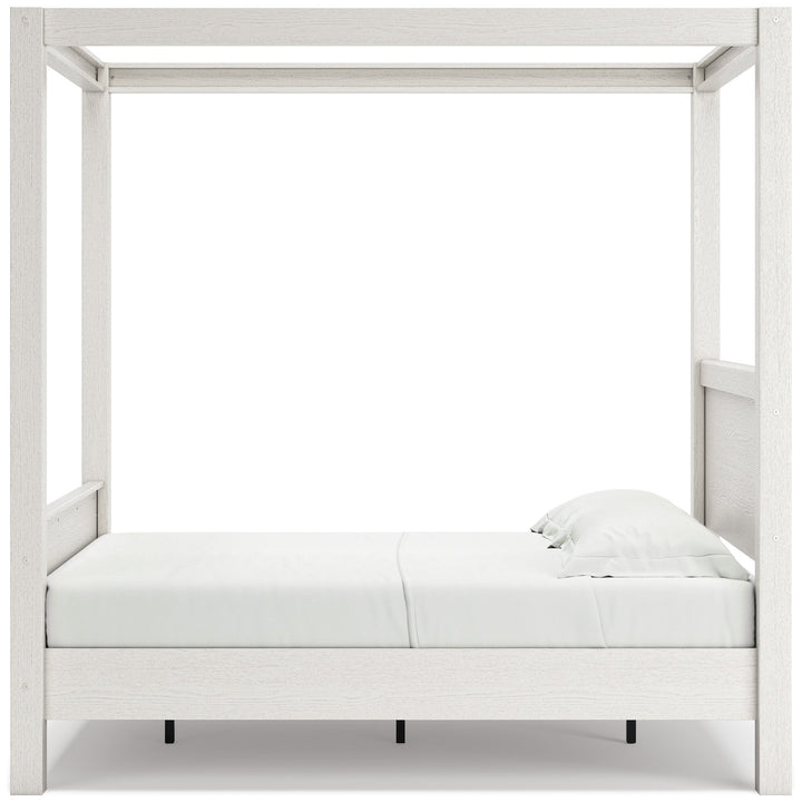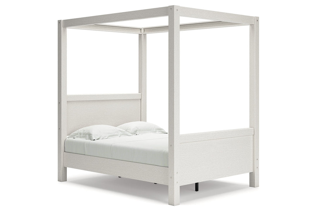 Dare to take minimalism to the max. The Aprilyn full canopy bed has an air of sleek simplicity thanks to its white painted finish with subtle replicated wood grain. The canopy posts take the bed's streamlined design to new heights, adding depth and dimension to your space. There's no doubt about it: This contemporary piece is sure to become a classic.