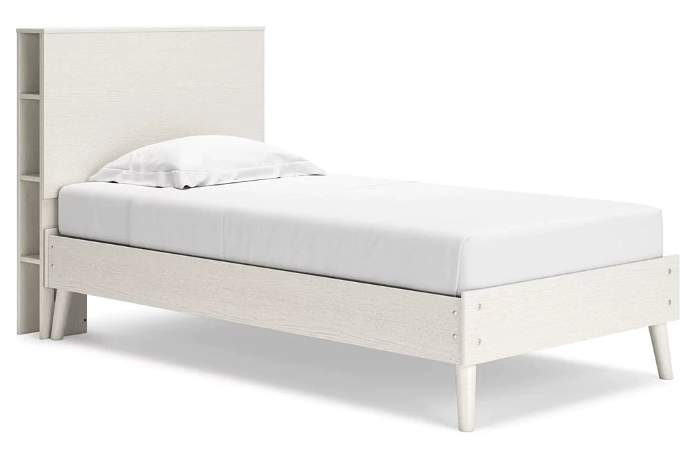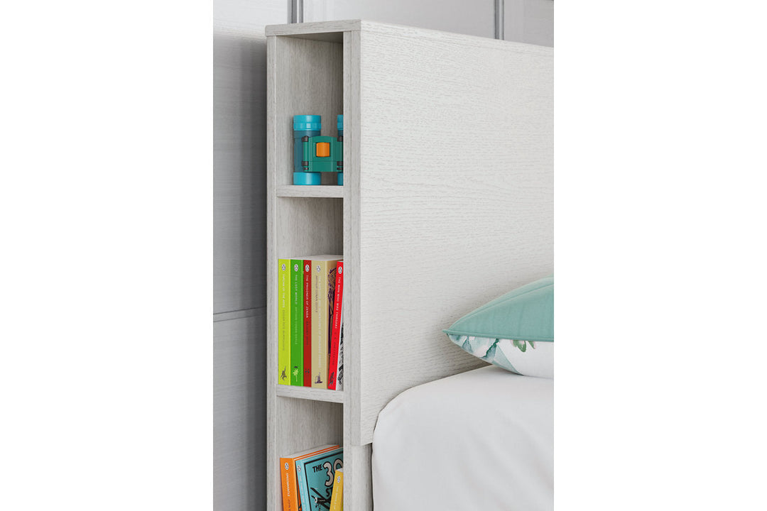 Dare to take minimalism to the max. The Aprilyn full bookcase bed has an air of sleek simplicity thanks to its white painted finish with subtle replicated wood grain. A space-efficient storage option, cubbies along the side of the headboard ensure you can keep your favorite reads within reach. USB charging keeps up with your high-tech lifestyle. There's no doubt about it: This contemporary piece is sure to become a classic.