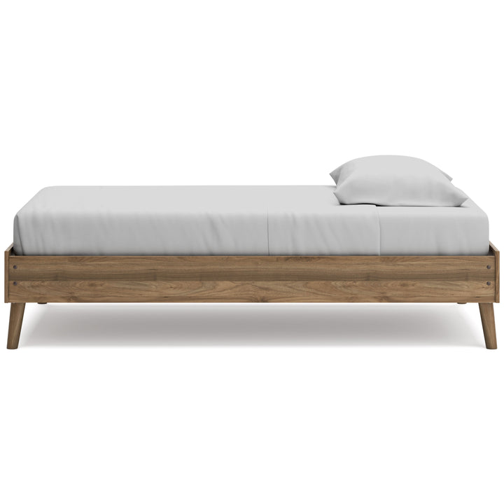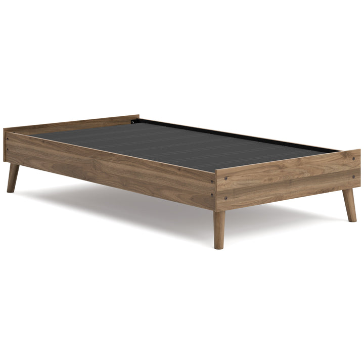Dare to take minimalism to the max. The Aprilyn twin platform bed has a richly relaxed feel thanks to its honey brown finish over replicated wood grain. Magnificently mod splay legs are a compelling complement to the streamlined design. There's no doubt about it: This contemporary piece is sure to become a classic.