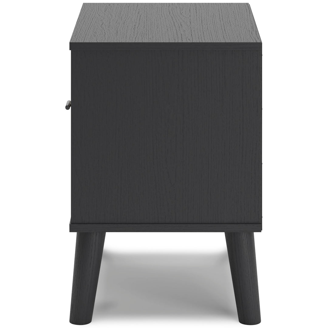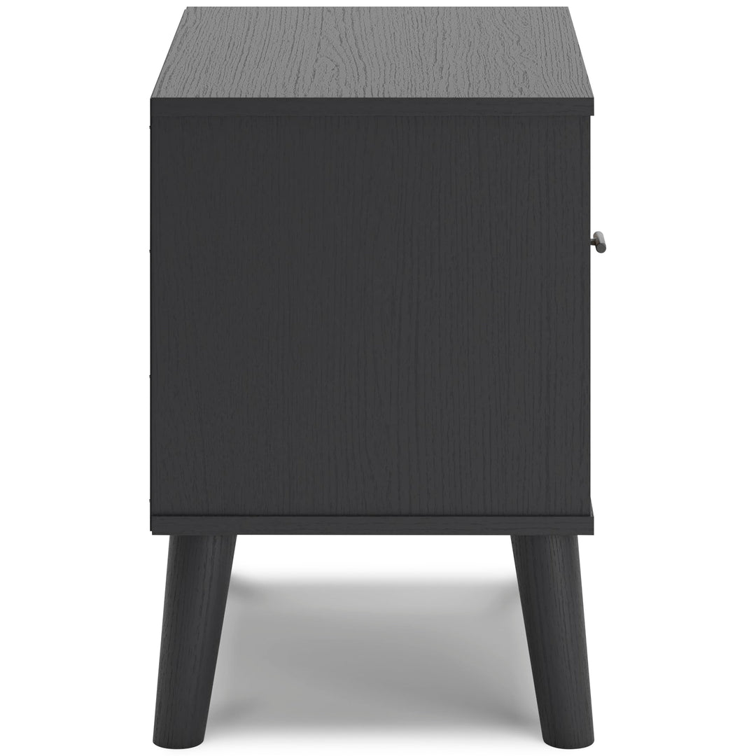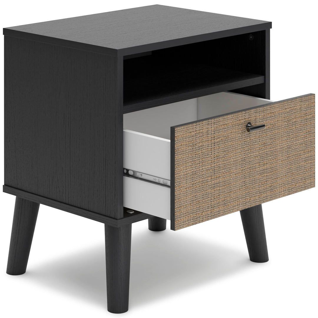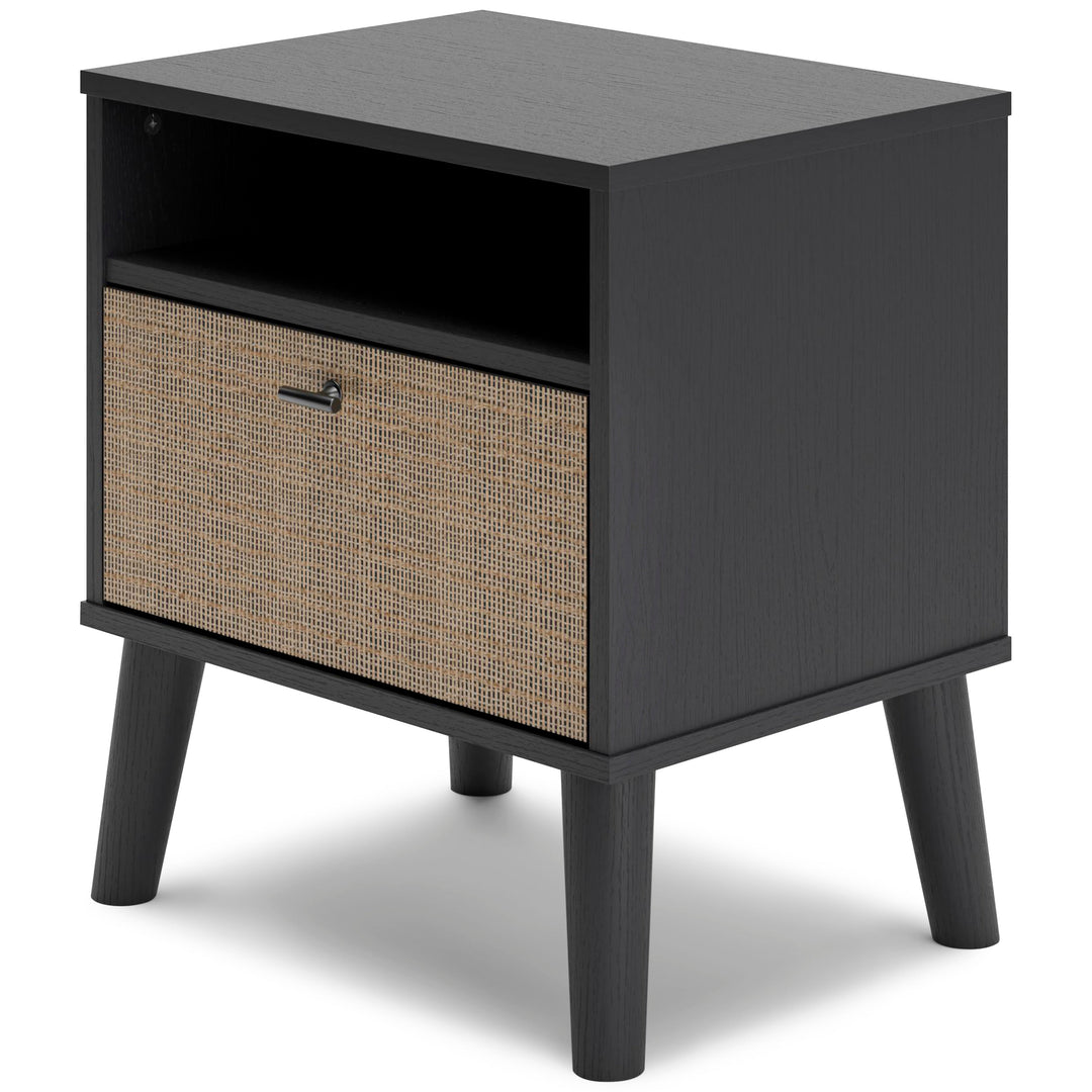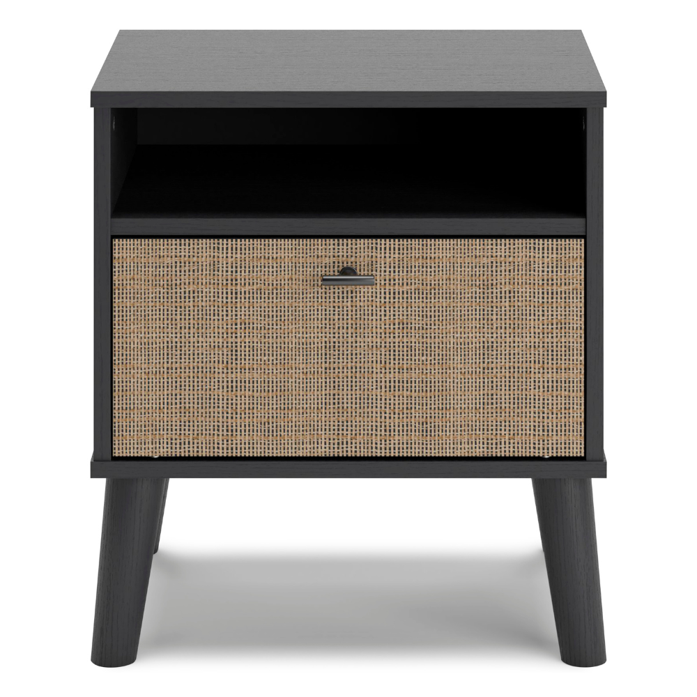 Made with engineered wood (MDF/particleboard/plywood) and decorative laminate for the right balance of affordability and durability;Matte black finish with subtle replicated wood grain;Drawer front with replicated beige cane finish;Matte black knob;Smooth-gliding drawer with vinyl-wrapped sides and back;Open shelving;Splay legs;Assembly required