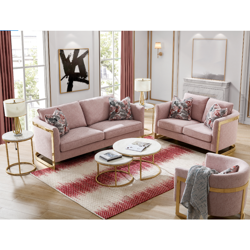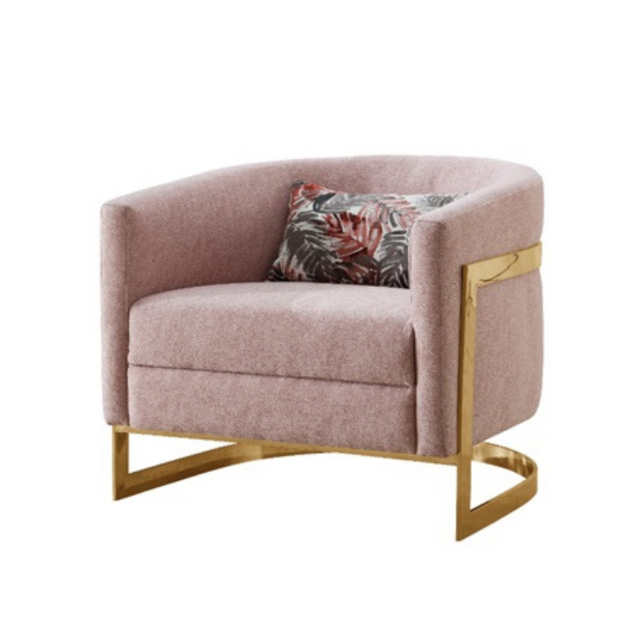 Lounge in luxury with this versatile and sturdy Danah Chair by Roots Furniture that ensures convenience and durability. This berry pink chair with gold accents and a patterned cushion adds an unmistakable beauty to any living room.