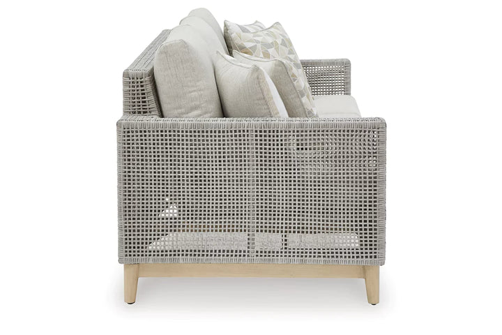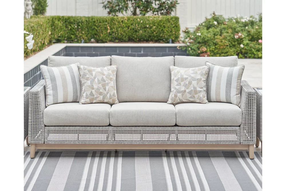 The Seton Creek sofa invites your casual contemporary style outdoors. With its resin wicker in a chic neutral hue, it expertly marries refined design with durability. Breezy summer mornings and cold winter nights are made all the more comfortable with high-performance Nuvella+™ fabric covering the cushion.