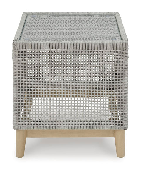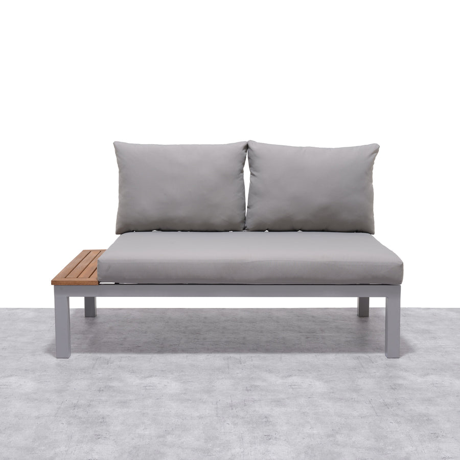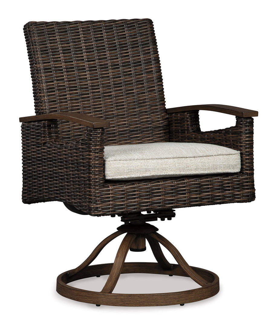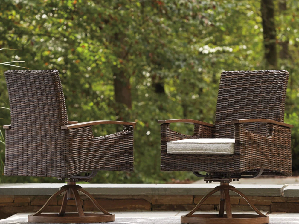 All-weather resin wicker over aluminum frame Legs with wood-look painted finish Solution-dyed high-performance fabric Nuvella+ is an outdoor fabric that can be cleaned and offers enhanced UV resistance Clean fabric with mild soap and water, let air dry.