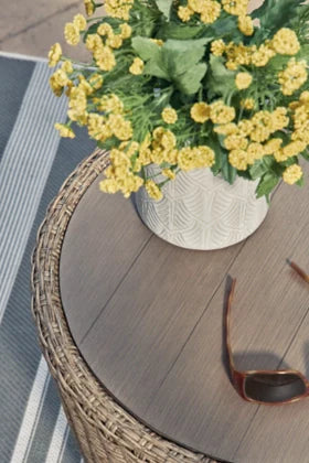 All-weather resin wicker handwoven over rust-free aluminum frame with durable powder coated finish;Aluminum top;Stainless steel hardware;Designed to withstand the harsh elements of the outdoors;Assembly required