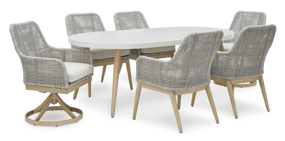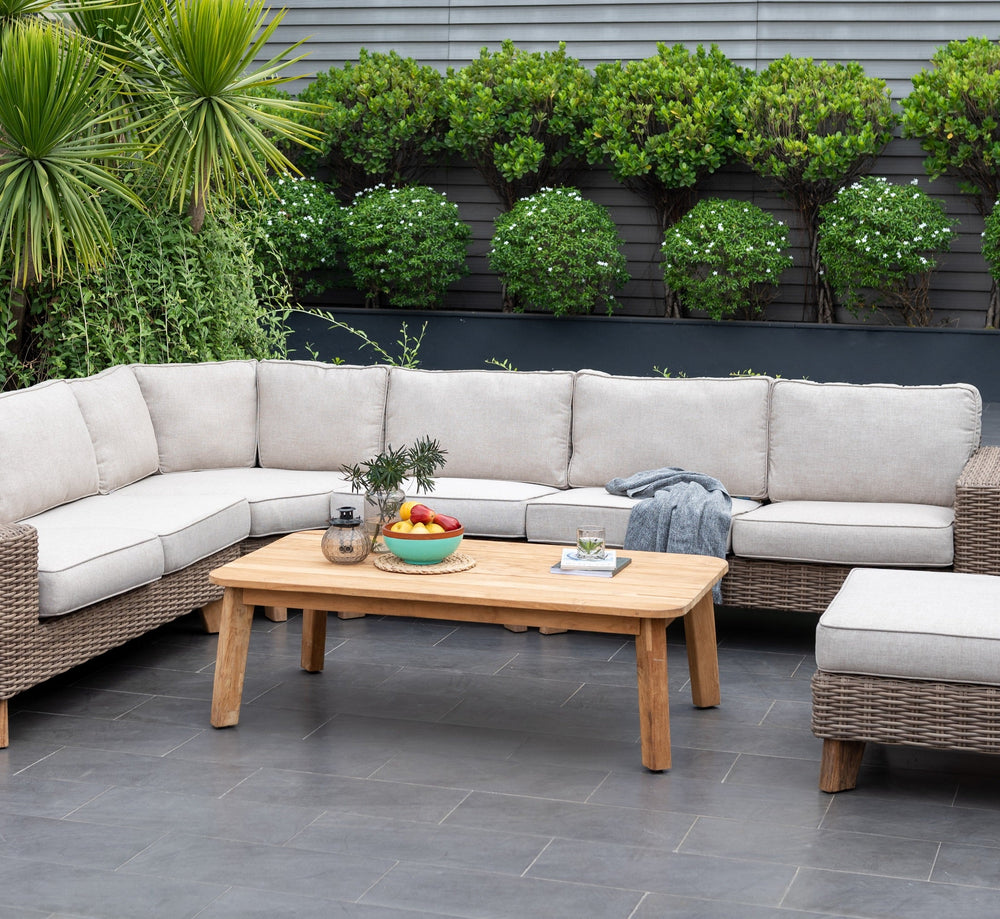 All-weather resin wicker over aluminum frame, Legs with wood-look painted finish, Solution-dyed high-performance fabric.