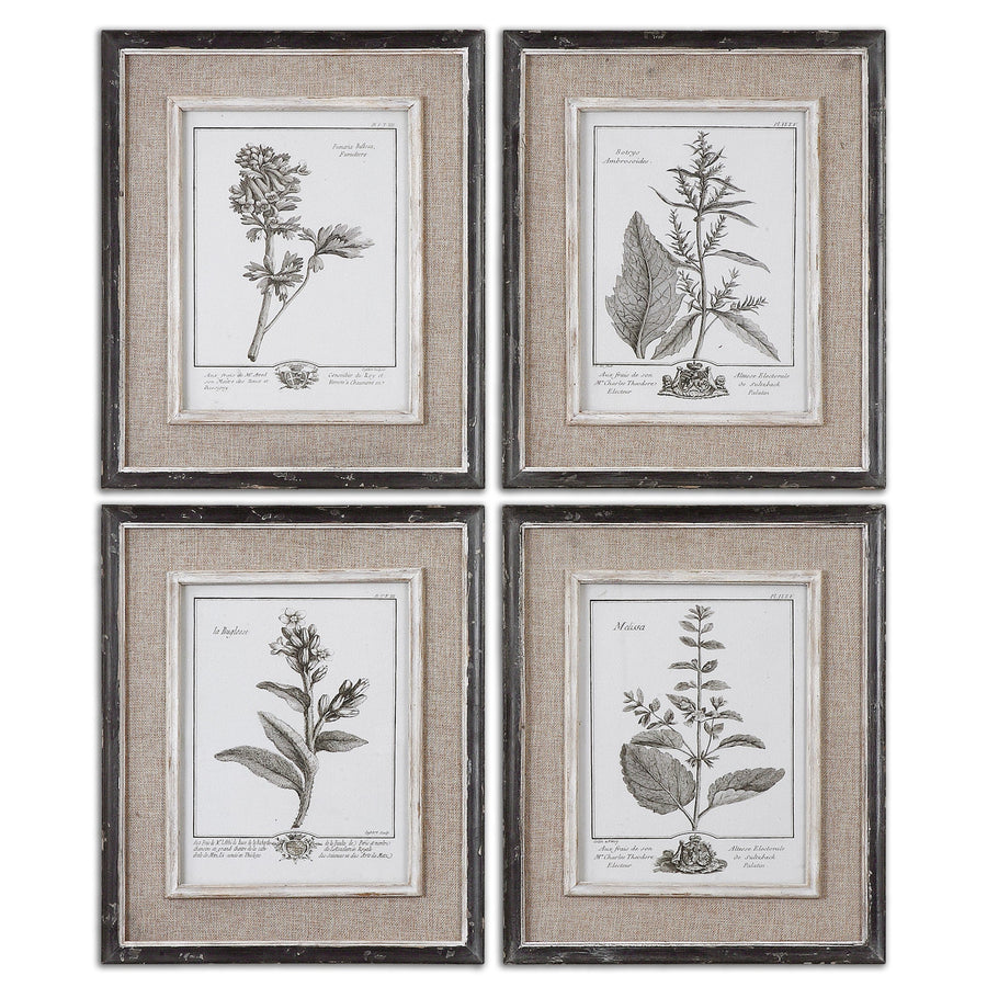 These Botanical Prints Feature A Contemporary Take On An Antique Style. Each Black And White Print Is Surrounded By A Light Tan Burlap Mat. The Outer Frames Have A Heavily Distressed Black Finish With A Gray And Taupe Wash. The Inner Lips And Fillets Have A Medium Wood Tone Base With A Heavily Distressed White Painted Finish And A Gray And Taupe Glaze. Each Print Is Placed Under Protective Glass.