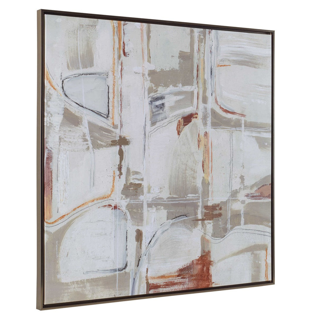 Giclee on canvas, the Neutral Nirvana abstract features the perfect balance of tan and cream highlighted with rust and terra cotta accents. Surrounded by a solid wood gallery frame in bronze gold finish, this piece may be hung horizontal or vertical. Each canvas is proudly handcrafted and printed in the USA. Artwork by Danhui Nai.