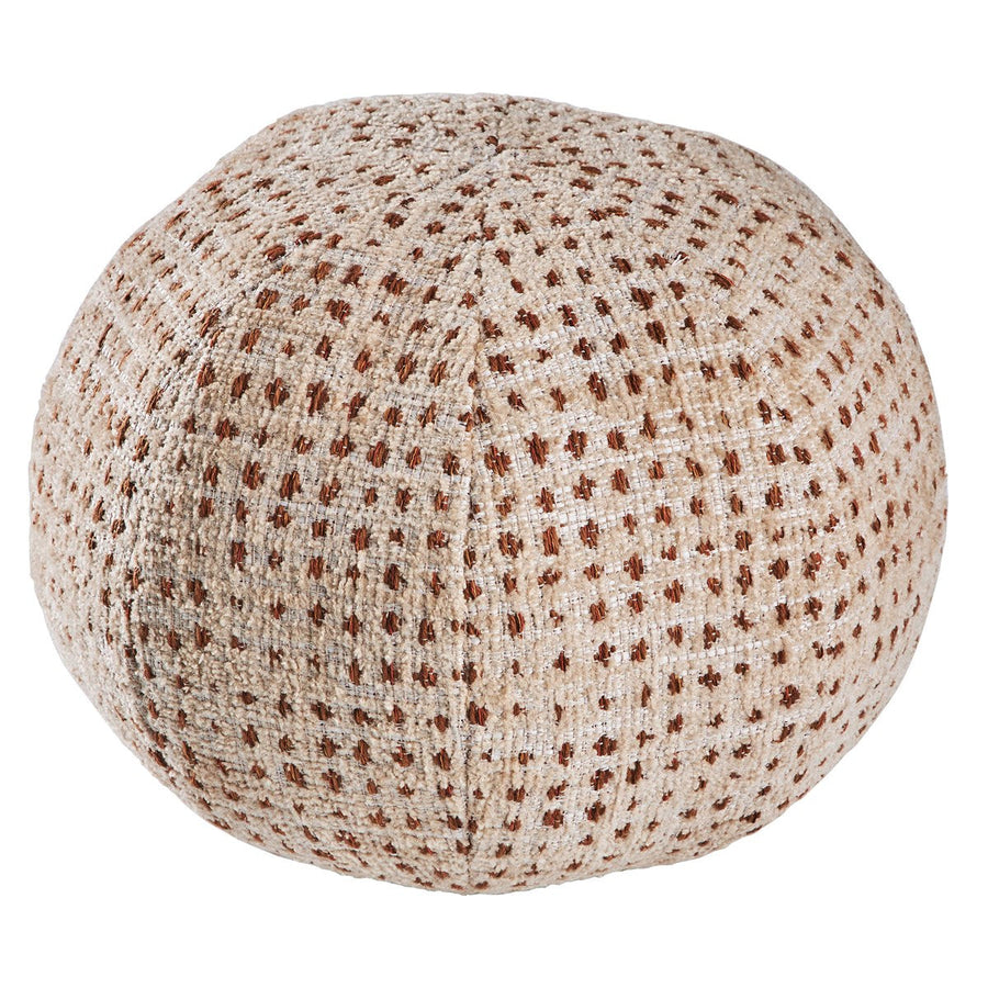 This playful pillow defies all square traditions. Its comfy sphere shape makes for a great armrest, or place behind your head for a quick rest. Made in a gorgeous chenille of blush with deep copper dots.