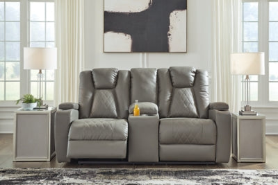 Pull tab reclining motion;Corner-blocked frame with metal reinforced seat;Attached back and seat cushions;High-resiliency foam cushions wrapped in thick poly fiber;Faux leather upholstery;Storage arms with built-in cup holders;Center console,Reclining Loveseat with Console