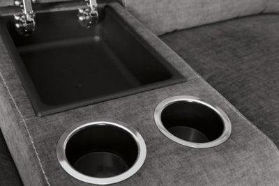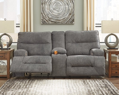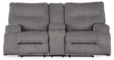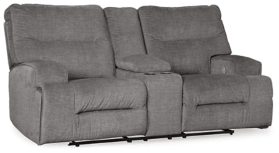 The Coombs reclining power loveseat with console makes it hip to be square. Brilliantly boxy profile and wide track arms infuse a highly contemporary look you don’t often find in reclining furniture. Rest assured, the trendy charcoal-tone upholstery is sumptuously soft—and made all the more enticing with deep channel tufting for clean-lined flair. Along with dual cup holders and handy storage in the center console, you’ll enjoy a one-touch power control with USB port to keep devices charged while you unplug.