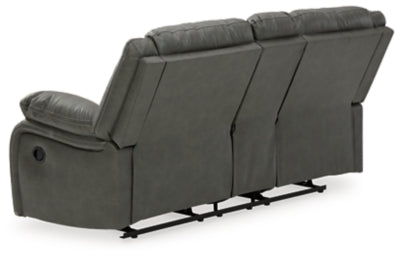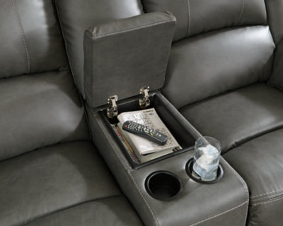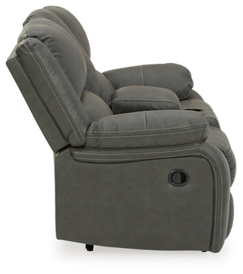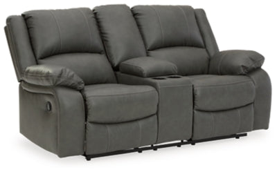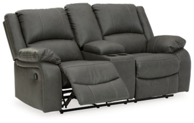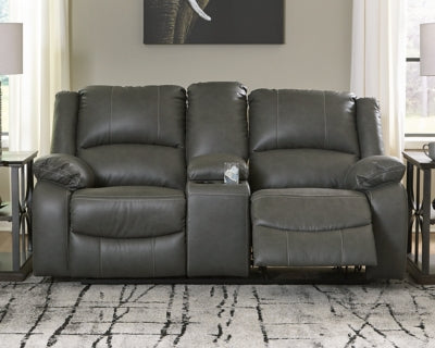 Sleek and streamlined, the Calderwell reclining loveseat with center console draws out your leisure time with its bustle back construction and thickly cushioned armrests. The super soft faux leather gets a high-end tweak with jumbo contrast stitching so you don’t have to sacrifice style for comfort. Sink into the comfortably supportive cushions and stretch your evening as long as you can with the added convenience of a center console at your fingertips.