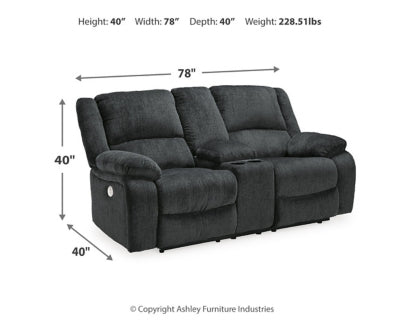 Built for luxury, the Draycoll power reclining loveseat with center console lets you kick back in reliable style. The thick, softly textured chenille upholstery provides a comfy surface on which to lounge. With bustle back construction and thickly cushioned armrests, this piece gives you the dependable, powered support you need to unwind with the convenience of the center console to ease your evening.