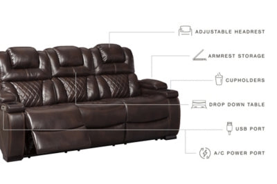 Your modern living room awaits with the Warnerton power reclining sofa. Complete with practical faux leather upholstery, one-touch power controls, adjustable headrests and USB ports, it makes finding the best seat in the house a breeze. What a perk that the center seat is crafted with a drop-down table with power/USB plug-ins and dual cup holders. Armrests with storage and cup holders keep drinks, snacks and remotes close by. Go ahead—treat yourself to a high-design home theater experience, priced to put you at ease.