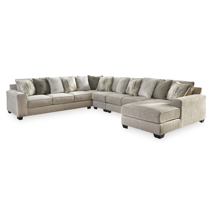 Includes 5 pieces: right-arm facing corner chaise, armless loveseat, armless chair, left-arm facing sofa and wedge;"Left-arm" and "right-arm" describe the position of the arm when you face the piece;Polyester chenille upholstery and pillows;Reversible cushions;High-resiliency foam cushions wrapped in thick poly fiber;Corner-blocked frame;Platform foundation system resists sagging 3x better than spring system after 20,000 testing cycles by providing more even support;Smooth platform foundation maintains tight, wrinkle-free look without dips or sags that can occur over time with sinuous spring foundations;Exposed feet with faux wood finish;12 accent pillows included