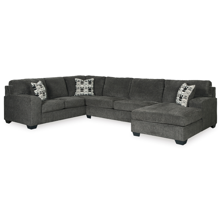Includes 3 pieces: right-arm facing corner chaise, armless loveseat and left-arm facing sofa;"Left-arm" and "right-arm" describe the position of the arm when you face the piece;Corner-blocked frame;Attached back and loose seat cushions;High-resiliency foam cushions wrapped in thick poly fiber;3 toss pillows included;Pillows with soft polyfill;Polyester upholstery and pillows;Exposed feet with faux wood finish