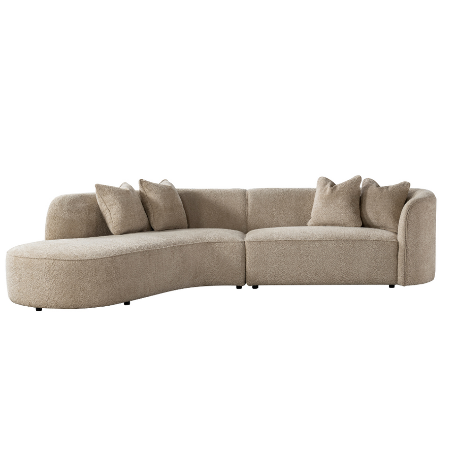Enjoy spending time with family or friends in this inviting Boucle Beige Sectional by Roots Furniture. This chic sectional is very modern and unique, perfect for impressing while decompressing. With tan accents, an asymmetrical design, and padded cushions, you won't find another piece that combines ideal poshness with perfect softness.