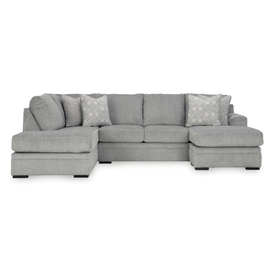 Don’t be limited by a lack of space. The Casselbury sectional makes family movie nights and get-togethers with friends all the more cozy. With its double-chaise configuration, everyone has a spot to lounge. A trendy gray hue offers the contemporary style you crave. So sit back and relax—this functional piece is ready to indulge you with everyday comfort.