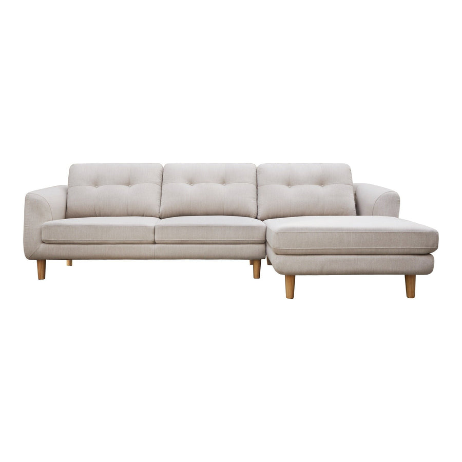 The Corey is a sophisticated sofa chaise with finely tailored upholstery, loose back cushions and solid wood legs. Available with a right or left chaise.