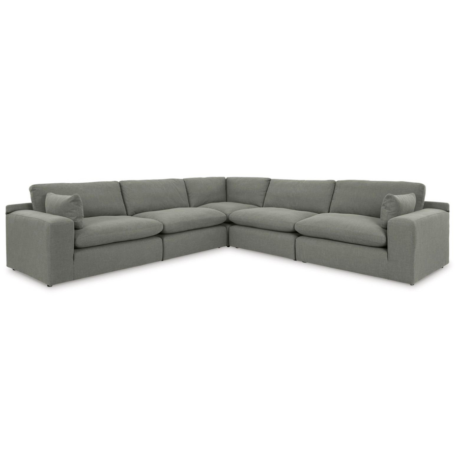 Includes 5 pieces: left-arm facing corner chair, right-arm facing corner chair, wedge and 2 armless chairs;"Left-arm" and "right-arm" describe the position of the arm when you face the piece;Pieces can float anywhere; sides are finished (with no connectors);Corner-blocked frame;Loose reversible cushions;Seat cushions with feather-fiber blend encasing a foam core ;Feather/fiber blend back cushions and bolster pillows;Polyester upholstery;Non-skid legs;Platform foundation system resists sagging 3x better than spring system after 20,000 testing cycles by providing more even support;Smooth platform foundation maintains tight, wrinkle-free look without dips or sags that can occur over time with sinuous spring foundations