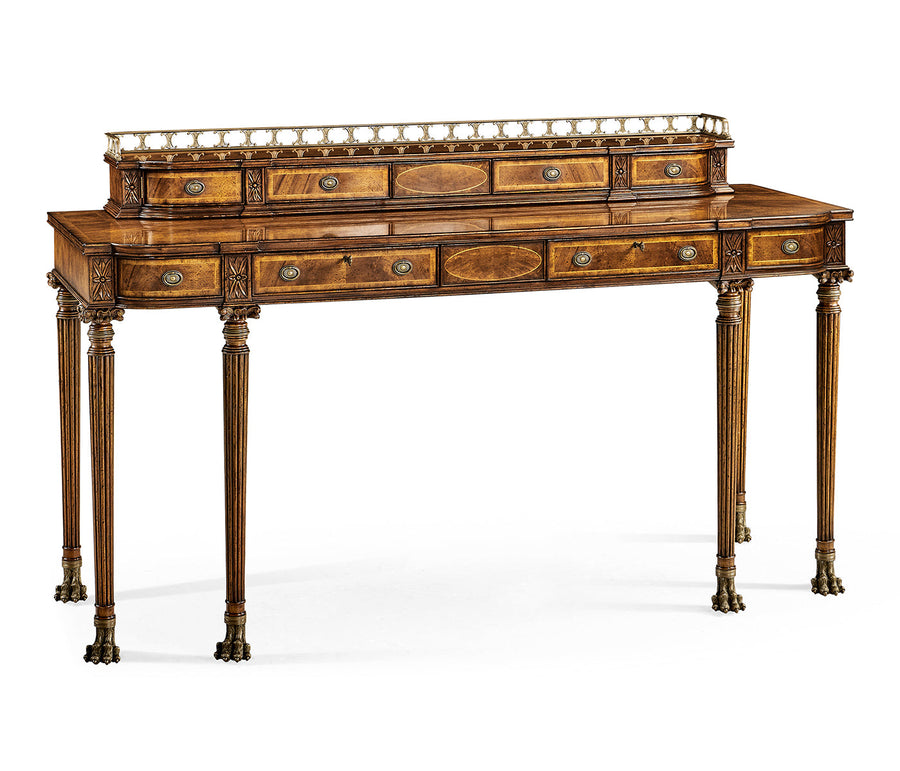Crotch walnut buffet or serving table with brass gallery