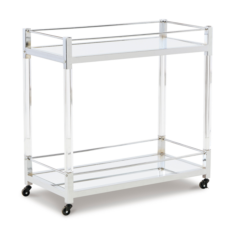 Reflect your love for contemporary style with the Chaseton bar cart. With two shelves made with mirrored glass, it adds both light and a touch of glam to your space. A clear acrylic and chrome-tone frame is a modern take on understated elegance. And thanks to rolling casters, serving your guests has never been easier.