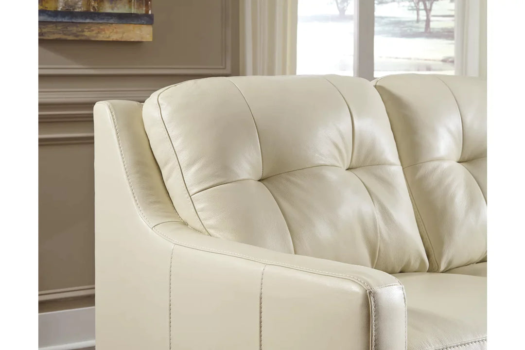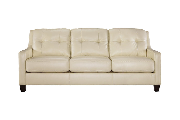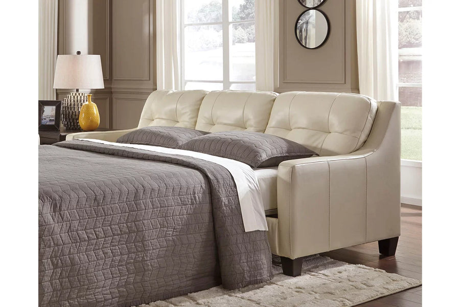 Keen on crisp, contemporary design? Adore the pleasure of leather? Look no further. The high-style O'Kean sofa sleeper satisfies on every level. Richly textured and decadently supple, the upholstery wrapping the entire seating looks like leather because it is leather. And there’s nothing like the real thing. Elements including slim, sloped track arms, box cushions and buttonless tufting add just enough refinement to this sofa sleeper’s decidedly clean-lined profile. An easy-lift queen-size mattress made of quality memory foam offers overnight guests added comfort.- Corner-blocked frame