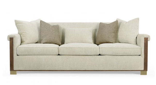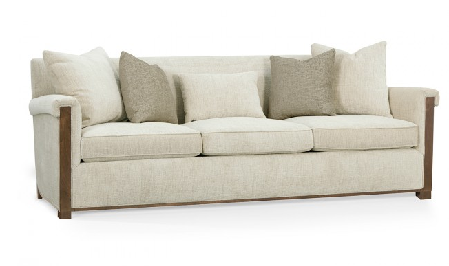 Sofa is constructed of a hardwood frame with a eight-way hand tied foundation. Sofa is covered in a Jonathan Charles performance fabric. Exposed frame is built from American walnut. Upholstered in Shambala (F400)