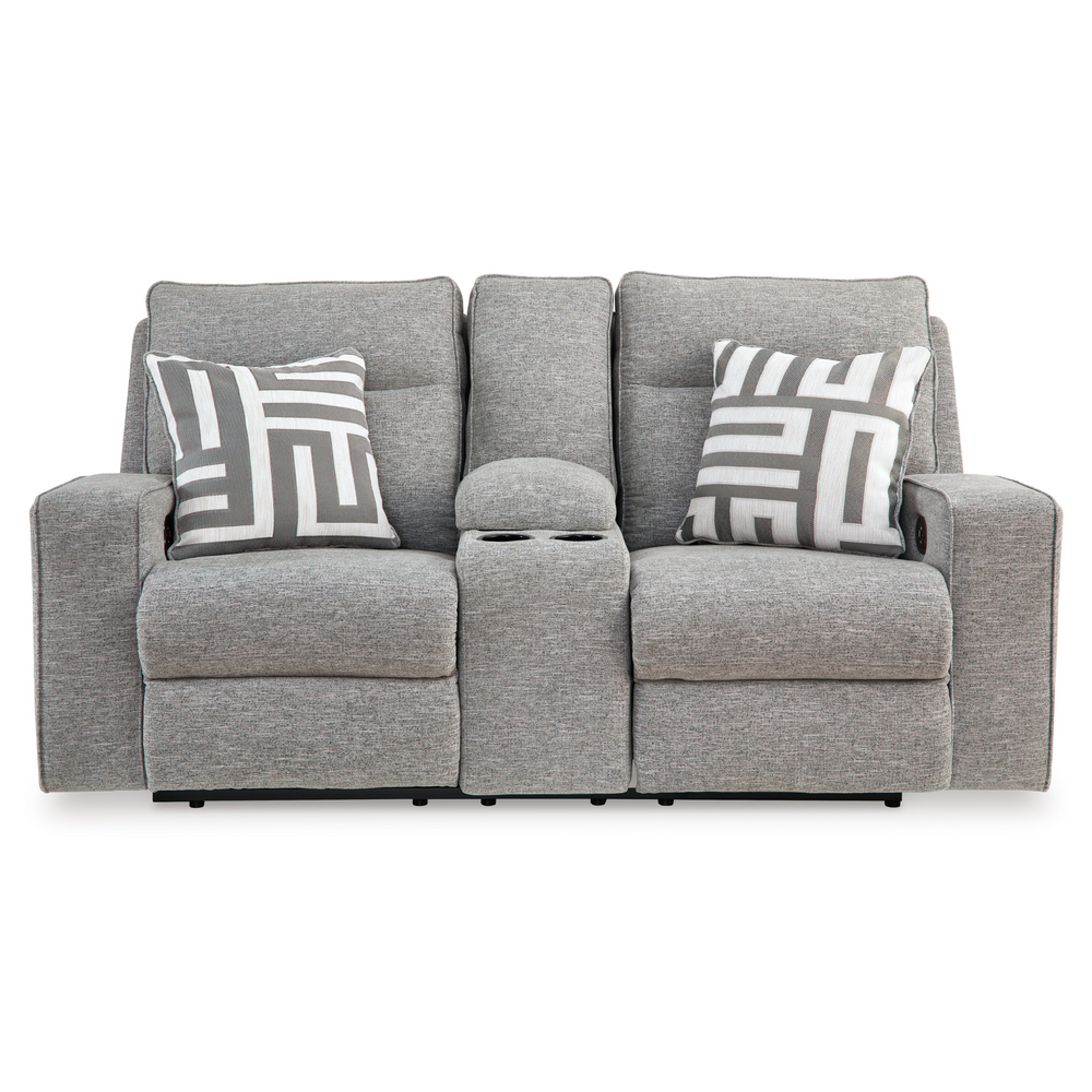 If style is the question, then the Biscoe power reclining loveseat is the answer. Its clean-lined profile is beautifully contemporary. High-performance fabric, machine-washable pillows and plump cushioning make it so easy to comfortably kick up your heels. The adjustable Easy View™ headrest allows a primo view of the TV, and the extended ottoman provides extra room to really stretch out. Simply sit back, chill out and recline away—this loveseat is designed to be your favorite seat in the house.