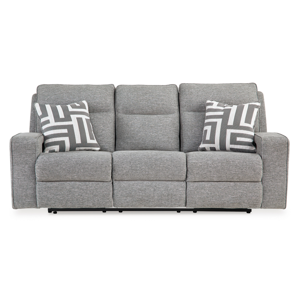 If style is the question, then the Biscoe power reclining sofa is the answer. Its clean-lined profile is beautifully contemporary. High-performance fabric, machine-washable pillows and plump cushioning make it so easy to comfortably kick up your heels. The adjustable Easy View™ headrest allows a primo view of the TV, and the extended ottoman provides extra room to really stretch out. Simply sit back, chill out and recline away—this sofa is designed to be your favorite seat in the house.