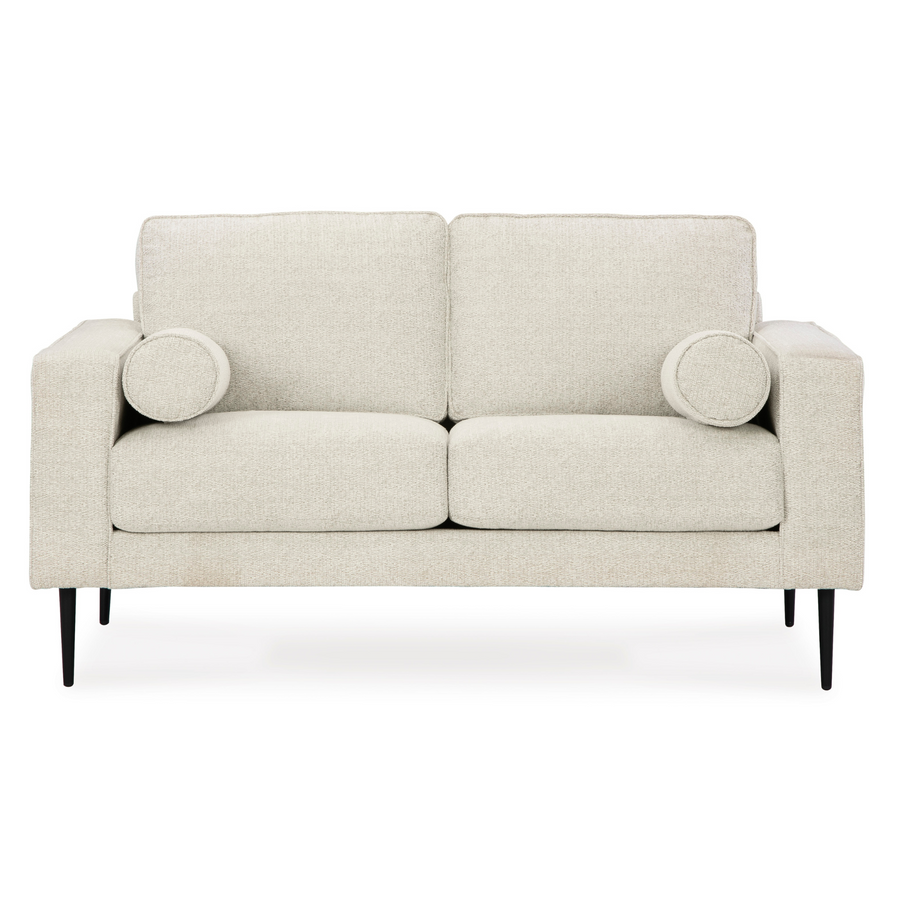 Simple comfort meets modern function in the Hazela loveseat. An apt addition to apartments and other small spaces, this slim-profiled piece welcomes you with its cozy character. A subtle chevron pattern on the cushions refresh the classic neutral hue, elevating the look while still suiting a variety of styles. Black accent legs add a dash of contemporary flair.