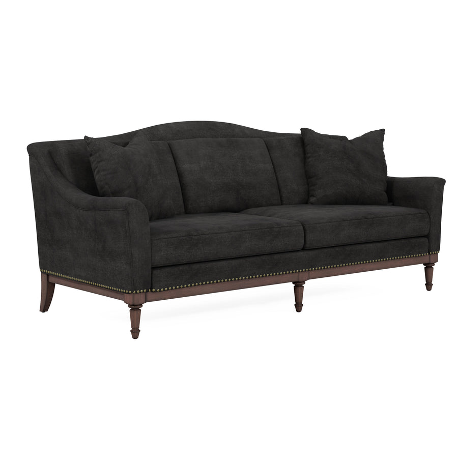 Features Camel back silhouette, Three (3) loose blend-down back cushions, Sineous spring seat construction with two (2) removable pocketed coil seat cushions, Includes two (2) 18-in x 18-in blend-down toss pillows, Aged brass nailhead trim along base, Handcrafted wood frame with turned front legs and metal ferrules, finished in Napa Mahogany, Charcoal velvet fabric upholstery