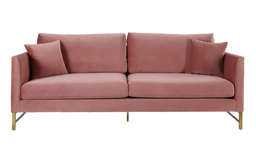 Indulge yourself with the timeless Massi Sofa from TOV. Set on gold stainless steel legs, this super comfortable sofa comes in a number of velvet color options. Features removable seat and back cushions as well as two matching throw pillows.
