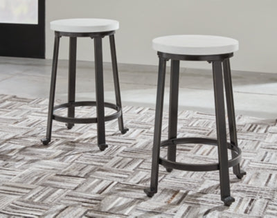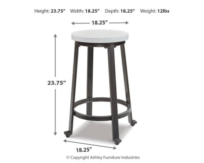 Talk about a cool counter stool. The Challiman stool's metal frame has a blackened pewter-tone finish and a distressed vintage white seat. The replicated plank design adds modern farmhouse feel that welcomes everyone home.