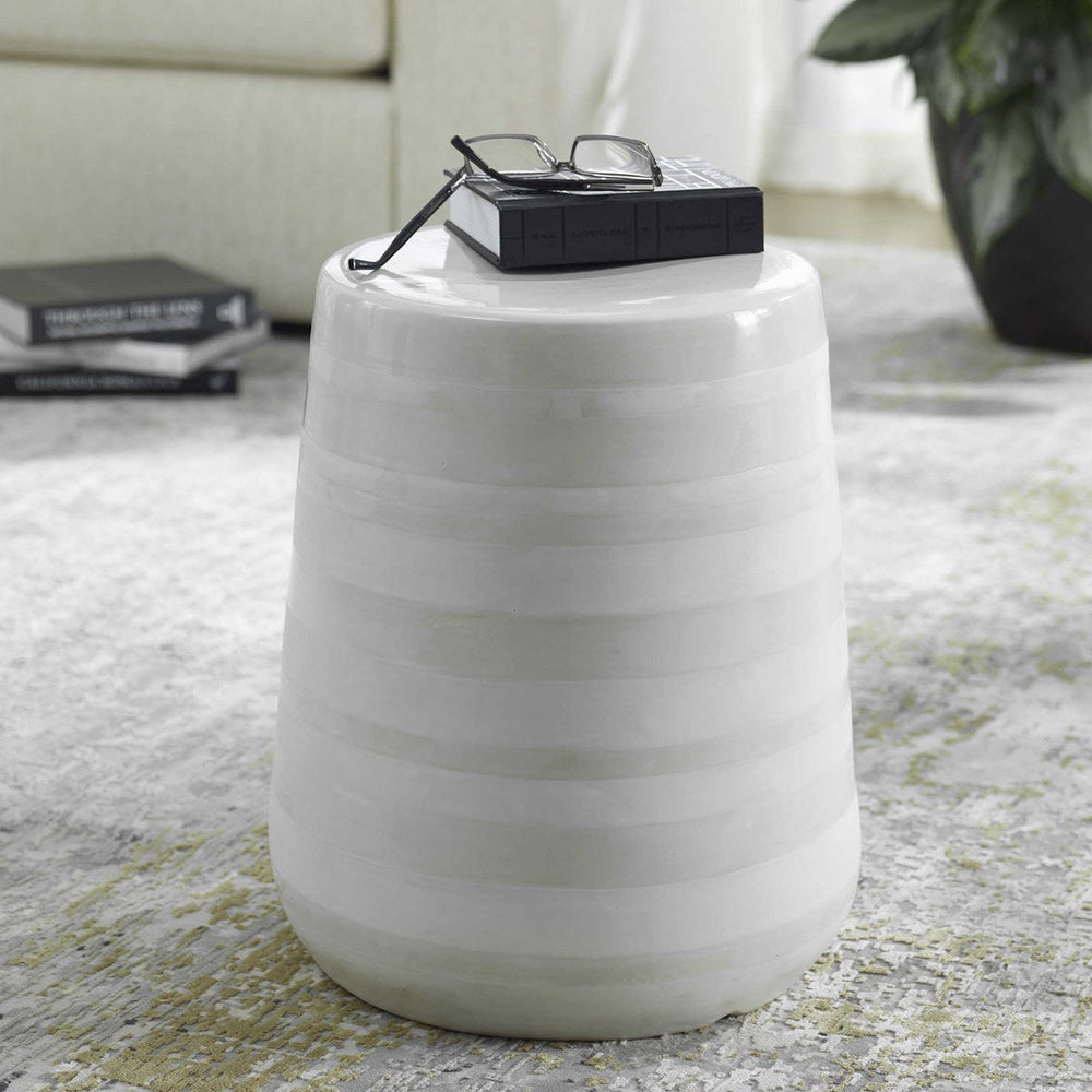 Inspired by tonal landscapes, the Desert Plains Garden Stool features a striped effect from gloss and matte white glazes. May be used outdoors, but protection from freezing temperatures is recommended.
