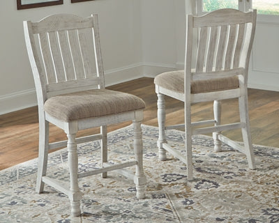 Have your fill of modern farmhouse style with the Havalance upholstered bar stool. Distressed vintage white finish is utterly charming. Bent slat back design and cushioned upholstered seat with woven oatmeal-tone fabric cater with beauty and comfort.