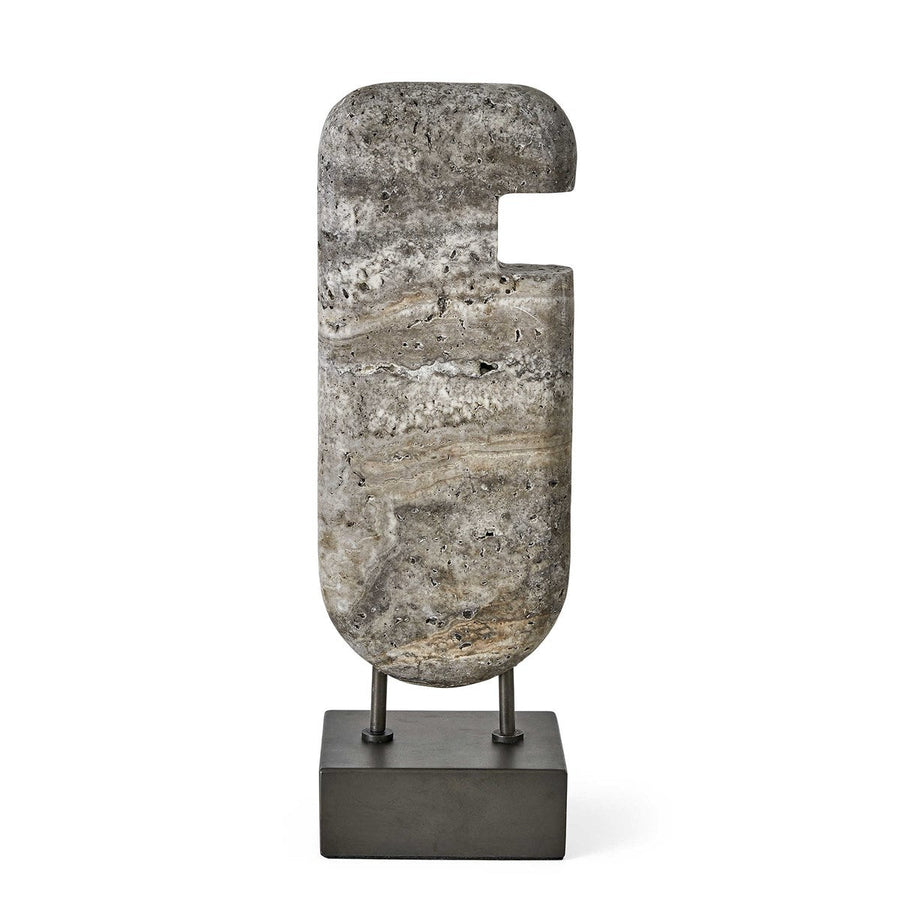 Icon-inspired and carved of gray unfilled travertine, this work is set on a bronzed steel base for a study in contrasts. Textured vs smooth, cool vs warm: the interplay invites a closer look whether displayed alone or as part of a grouping.