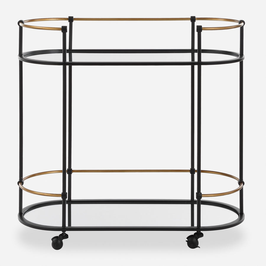 Highlighting a clean pill shaped design this bar cart brags of satin black finished iron legs accenting its antique gold features. Two plain mirrored shelves act as stylish space for your favorite glasses and sprits. Complete with rolling and locking casters.