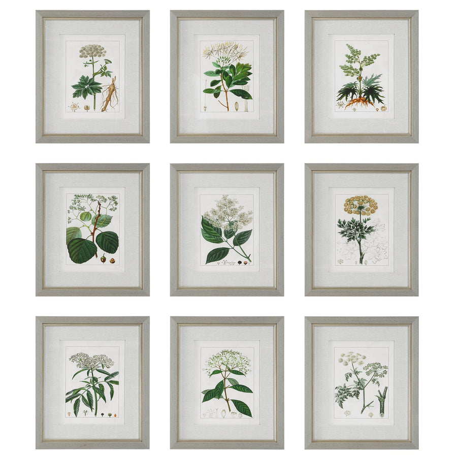 This set of nine botanical prints were originally created by French botanist and illustrator Pierre Turpin in the early 19th century. Each work of art is accented by an oatmeal linen wrapped mat and a light gray wood tone frame with a petite champagne liner. Prints are under glass.