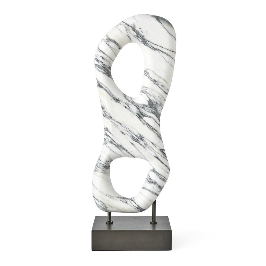 Arabescato marble is given a quiet, elegant, soft honed finish then set on a bronzed steel base. Easy to mix with bookshelf or tabletop displays, and a standout in black and white groupings. True to the nature of natural materials, each piece will have unique marbling and veining throughout.