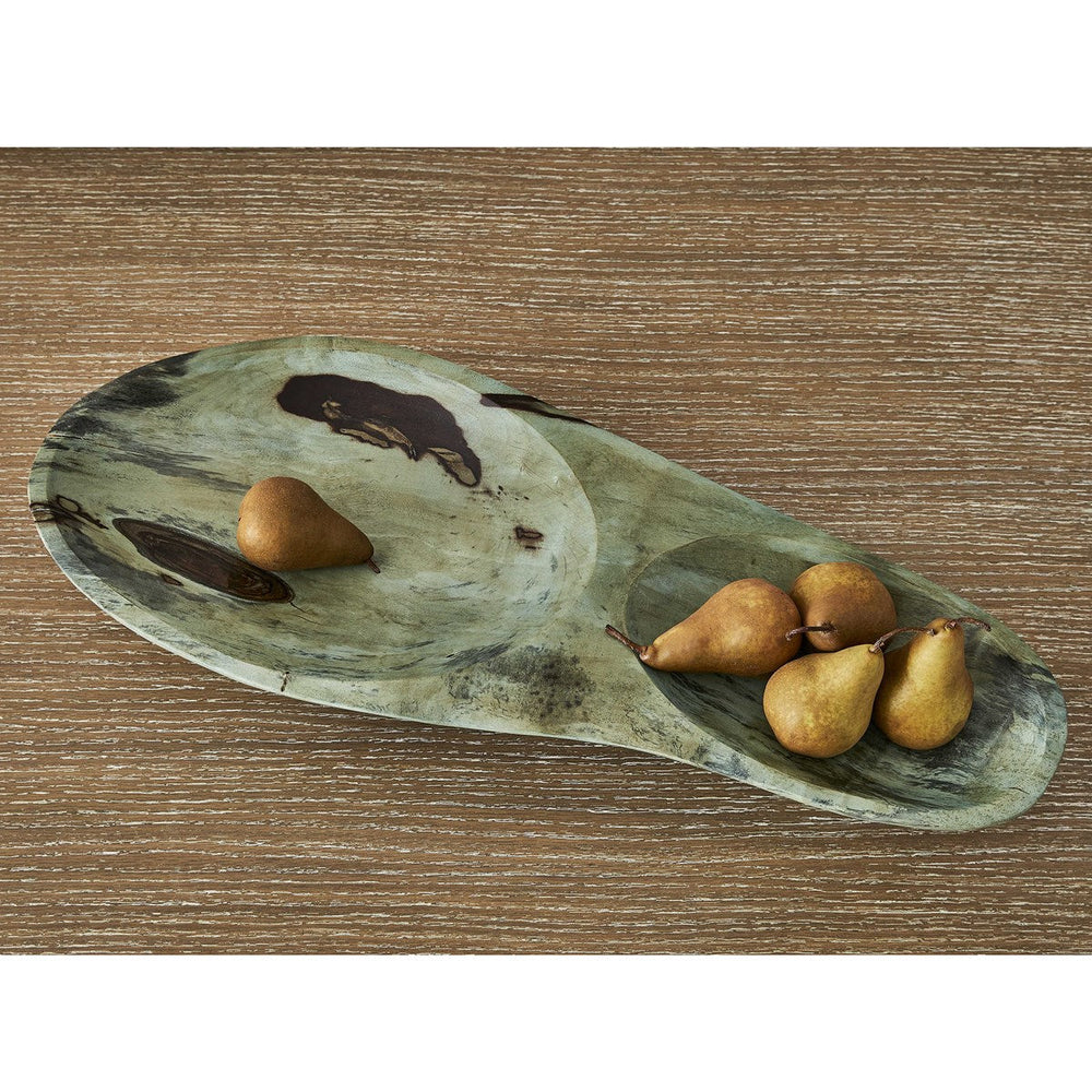 Carved from a single piece of tamarind wood with a soft organic shape, the two-bowl statement piece makes a great centerpiece. Since wood is a natural product, grain and soft green color will vary slightly.