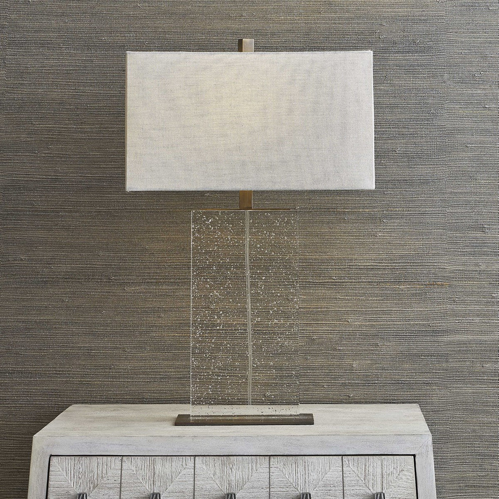 Gracefully tapered, subtly seeded, ash gray glass, accented with dark oxidized bronze plated iron details. The round hardback drum shade is a warm, chocolate gray linen fabric.