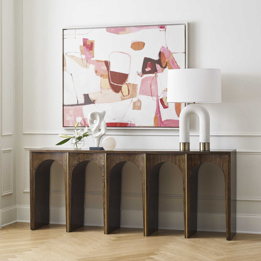 The U-Turn Lamp is sure to turn heads. The thick bend of white manmade stone rests atop two rich brass-finished feet. A thin brass neck holds the tapered oval hardback shade, which is then completed with a cylindrical brass finial.