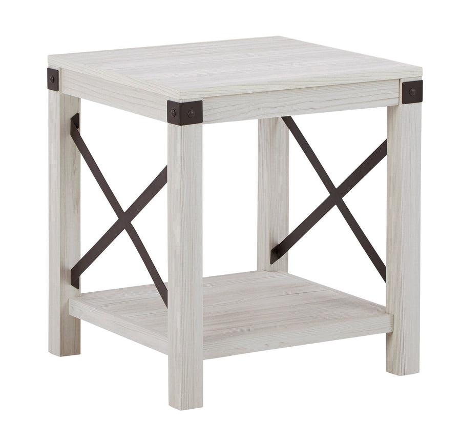 Entertain with ease with the casual, contemporary Bayflynn end table. Designed for the modern tastemaker, the minimalist design wows with crossbuck metal accents and a laminated surface with a whitewashed effect. An open display shelf provides ample space for books and baskets, or for showcasing your special decor accessories.