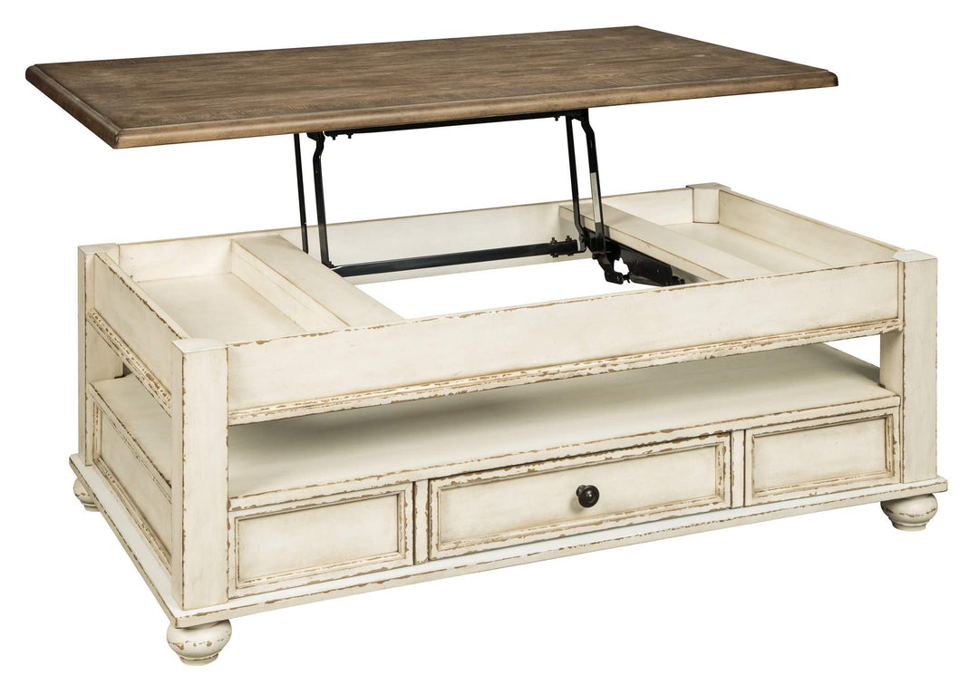 The Realyn lift top table set is traditional cottage styling taken to a new level. . Antiqued two-tone finish blends a chipped white with a distressed wood finished top for a double serving of charm. this coffee table with drawer and open shelf space melds function with exceptional form.